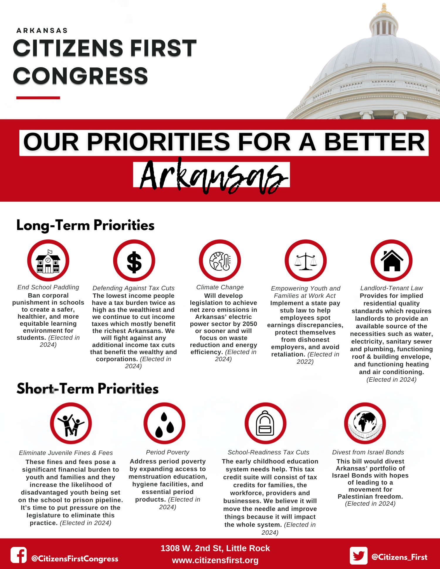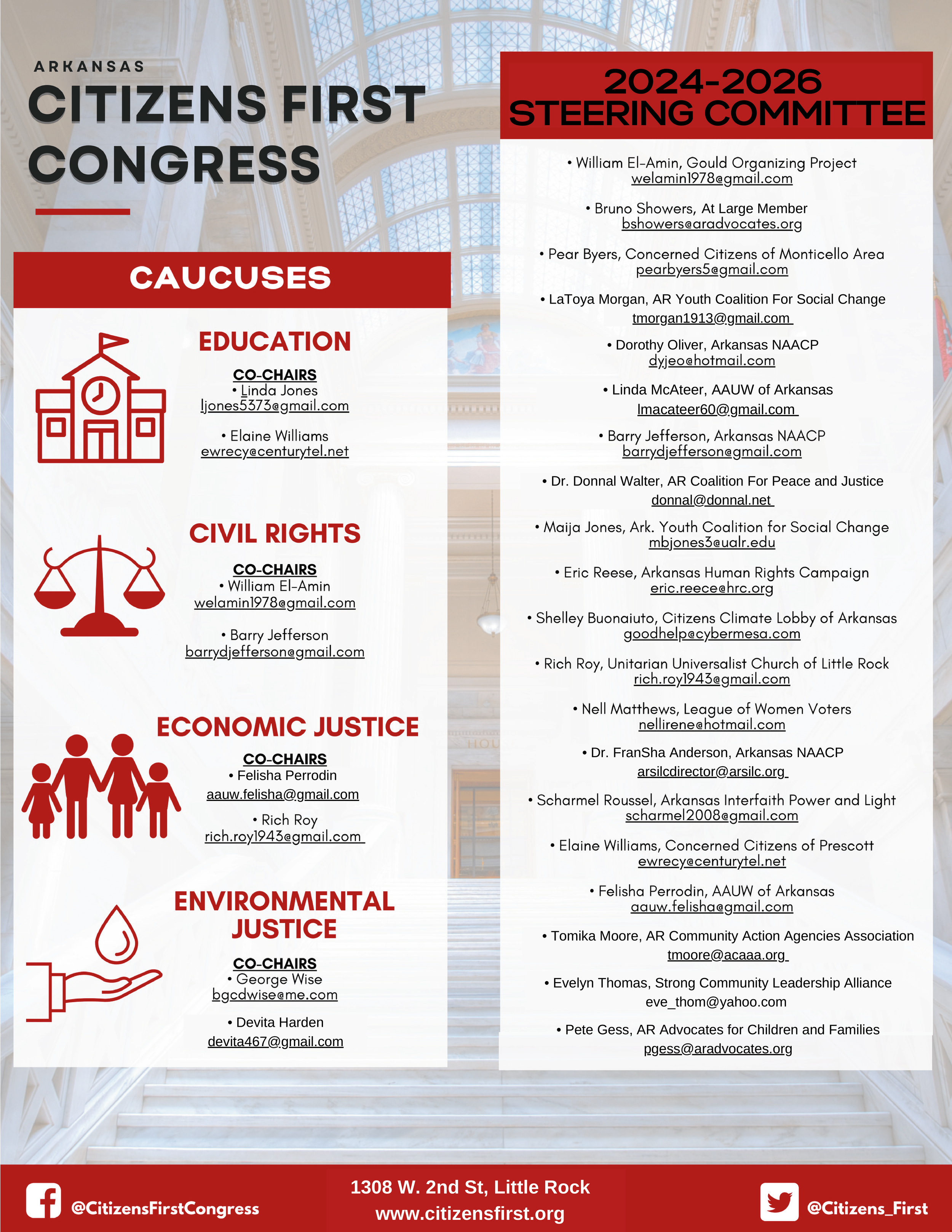 The Arkansas Citizens First Congress is a multi-issue and non-partisan coalition of more than 50 organizations who work together for progressive changes in state policy. Coalition members come from all corners of the state and work on many different issues. At the Arkansas Legislature, the coalition members lobby together on a common agenda. They also watchdog the legislature, and lobby against threats to progressive policy. The Arkansas Citizens First Congress has lobbied lawmakers at the Arkansas Legislature since 1999.